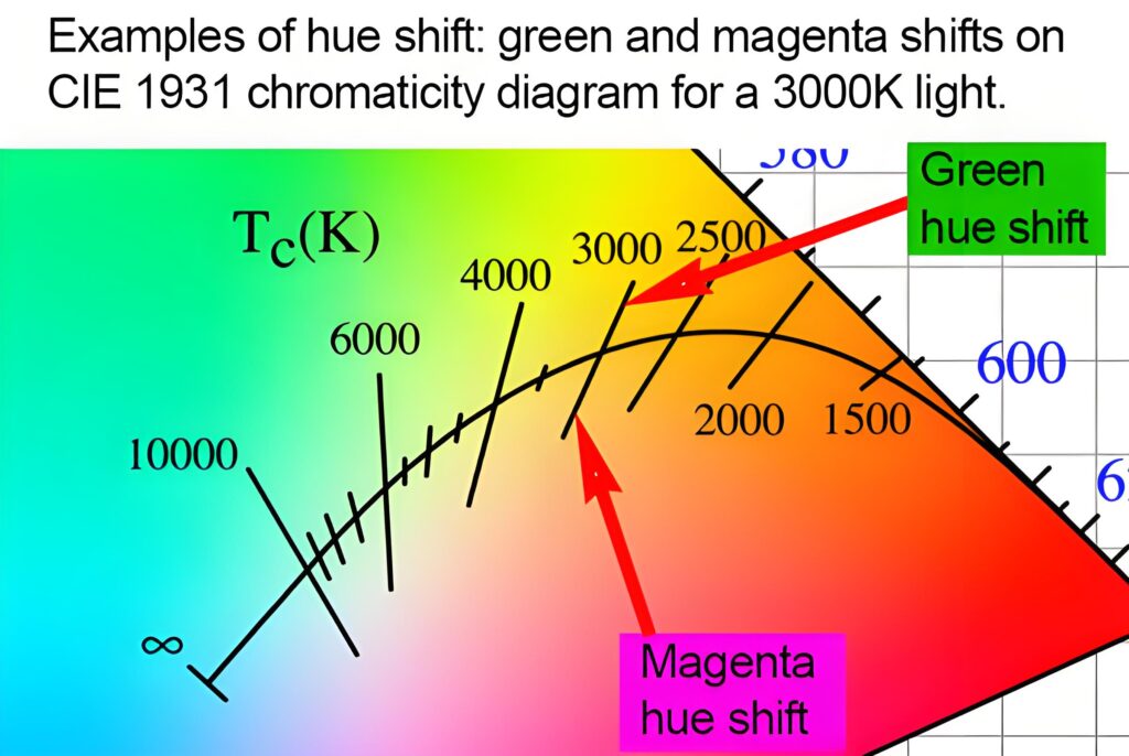 In the diagram, you can observe iso-CCT contours for various correlated color temperature values. These iso-CCT lines connect points sharing identical CCT measurements. For the 3000K isotherm, note how this contour originates from greenish hues in the region above the Planckian locus, then progressively transitions to pink/magenta tones as it extends below the blackbody curve.